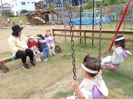 2025/12/01 11がつ☆すずらんグループ new園庭で簡単なルールのある、まてまておにごっこ『むっくりくまさん』をしました。保育者がくまのお面をかぶり、「ぐ~、ぐ~、むにゃ、むにゃ」と寝たふりをすると、それを囲んで子どもたちが集まり、「むっくりくまさん、あなのなか♪」と歌が始まります。くまに扮した保育者がいつ起きるのか、みんなで、わくわく、どきどき。「くまさん、おきて~!」の子どもたちの声で、保育者が「まて、まて~」と駆け出すと、「きゃあ~」と声を弾ませ、足取り軽く走り回っていましたよ。