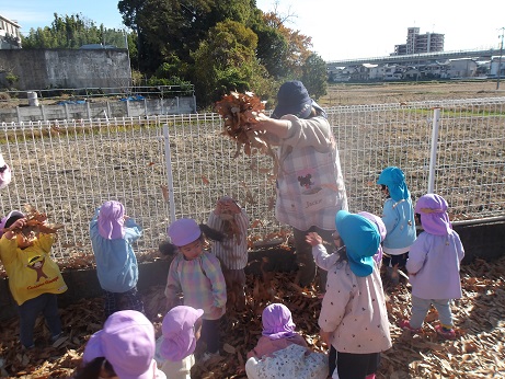 2025/12/26 12月☆すずらんグループ newあっという間に移り過ぎていく、秋から冬の季節を園庭で楽しみました。「たのしい!」と誰かの声で、あれよあれよという間に、みんなが集まり、落ち葉のシャワーが始まり、両手で落ち葉をすくうと、頭の上からパラパラ~。「もっといっぱい」と言いながら、両手に抱えきれないほどの落ち葉をすくう子もいて、「せんせい、かけて」とリクエストをしたり、中には落ち葉の山にダイブする子もいましたよ。砂場では、拾い集めた、まつぼっくりや、どんぐりを使いケーキを作って遊びました。ひとしきり遊び終えると、「お~い!」と、今度は、何やら上の方から声が聞こえてきて…。どんぐりやまの中腹に、すずらんグループのお友達を見つけるや否や、「まって~、いまいく」と四つん這いで斜面を登りきり、いつもとは少し違う目線の高さからの景色をみんなで共有しました。お互いの存在が気になるからこそ、気持ちのぶつかり合いも増えてきていますが、『楽しい気持ち』を共有することで、相手に共感する気持ちも育っています。4月から数えてあっという間に、もう12月。すずらんグループで過ごす残り3ヶ月も一緒にたくさん遊びましょうね。