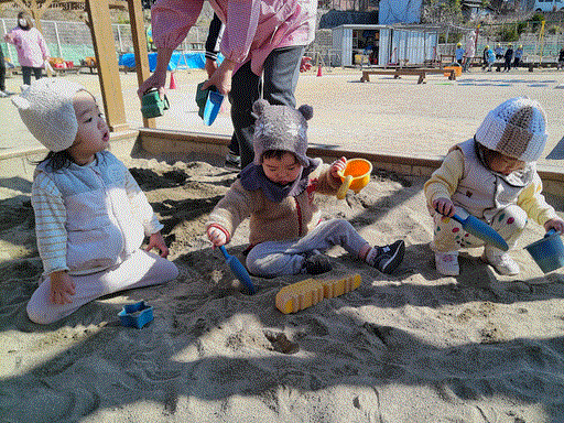 2026/03/02 2月☆つくしグループ newつくしさんも暖かい日は階段を下りて園庭へ遊びに行く日が増えてきました。幼児さんに優しくしてもらいながら、スコップやバケツを使って砂遊びを楽しんだり、砂をつかんで感触を楽しんだりしました。