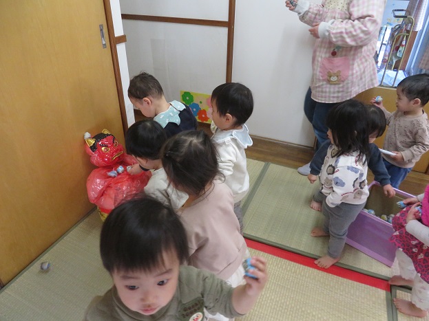 2026/02/24 2月☆たんぽぽグループ2月といえば節分。「おに~のパンツは♪」と何度も口ずさみ、かわいい鬼のタペストリーにボールをあてて節分ごっこを楽しんできました。節分当日たんぽぽさんに少し大きい赤鬼人形がやってくると、「ん・・・?」と不思議そうな表情に。余裕で近づき豆代わりの新聞紙ボールをあてる子、鬼さんの顔をのぞきこむ子、とーっても離れた距離から友だちの様子を見守る子まで、様々でした。保育者を真似して「おにはそとー!」と言える子もいましたよ。泣き虫鬼、怒りんぼ鬼、風邪ひき鬼などをやっつけました。