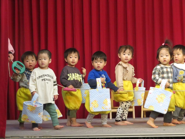 普段遊んでいることを発表会向けにアレンジして遊んでいます。順番に舞台に登場したり、お友達がお名前を発表している時は座って待つ、「今日の手遊びは何をしたい?」と保育者の問いかけに、答えたり、待ったり、自分で考えて行動したりと、簡単な決まりごとを守ることで楽しくなることを経験しています。
