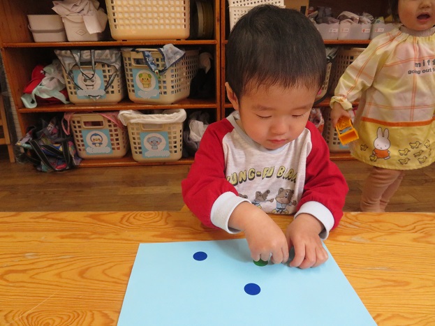 今月の製作は絵の具やシールでお雛様お内裏様をつくりました。手先指先が器用になり、力加減をするなどできることが増えてきましたよ。