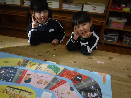 保育園では室内遊びでお正月遊びを取り入れ、コマやすごろく、福笑いと正月遊びに興味を持ち、異年齢で楽しむ姿が見られました。順番を守ったり、ルールを教えてあげたりと友だちとの関わりがより深まったように感じます!年下の子はすみれさんやちゅうりっぷさんの遊びが気になるようになり、一緒に入れてもらい遊びの幅が広がってきています!外は寒いですが、たくさん身体を動かし色々な遊びを経験していきます!