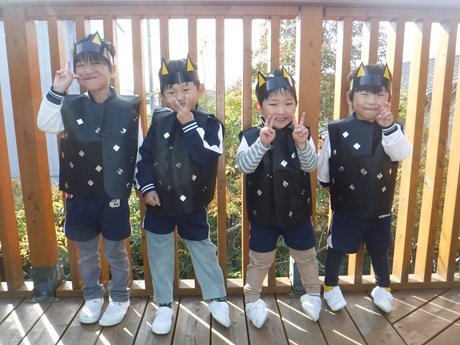 今年も元気にたくさん遊び楽しい一年を過ごすことが出来ました。ありがとうございます!来年もよろしくお願いします!2025/12/22 劇遊び楽しかったね☆子どもの好きな絵本を題材に始まった劇遊びごっこ。キツネの真似をし手作りの旗を持ち台詞を言いながら部屋を歩いている子や、他の動物になりきり一緒に遊んだりと日常の遊びに表現することを楽しむ姿が見られました。舞台練習が始まると、始めは緊張して表情が固まっている子もいましたが、友だちと考えた身振り手振りや歌で親しんでいくと自然と緊張がほぐれ、自信へとつながっていきました。すみれさんはどの役の話も覚えており、友だちを助けてあげる姿がみられたり、ちゅうりっぷさんは表現遊びに参加し自分の台詞を言うことに喜びを感じていました!絵本から「いちご作りたい」「はちみつは?」と小道具を作り、一つ一つ丁寧に製作していました。自分で作った物で遊ぶことに達成感を感じ、よりよい表現が見られました!れんげさんひまわりさんは、歌やダンスが好きな子が多く、年上の子に踊り方を教えてもらうと一生懸命踊りを覚え、友だち同士で一緒に楽しむことができました!