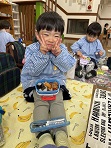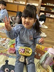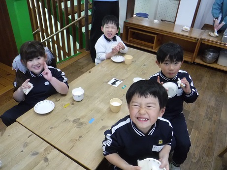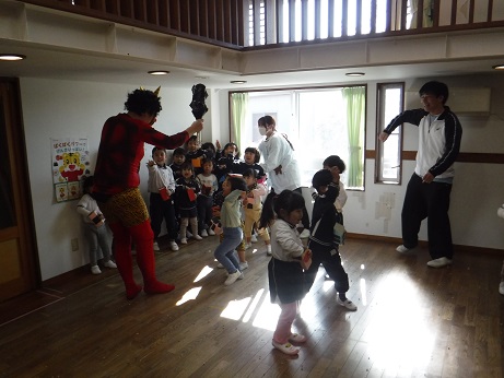 当日、ランチルームの部屋に行くと「怖い」と泣けてしまう子もいましたが、鬼がやってくると怖くてもやっつけようと豆を投げ「おにはそと、ふくはうち」と戦うことができました!最後に大きな豆で退治をすると鬼が逃げていき、表情が一気に柔らかくなり、福の神が来ることを待ち遠しくしていました。