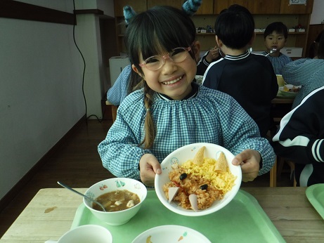 給食は赤鬼ランチ!自分で顔を作り、色々な表情のお顔があり、子どもたちの笑顔が沢山見られました!