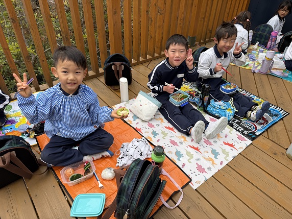 友だちとシートをくっつけお話しながら楽しむ姿が見られました。食べこぼしも少なくなり、れんげさんは箸で食べることに喜びを感じています。「すみれさん何してるかな?」と気に掛けている子もおり、「お弁当かな?」「ソリかな?」と想像して楽しんでいましたよ。