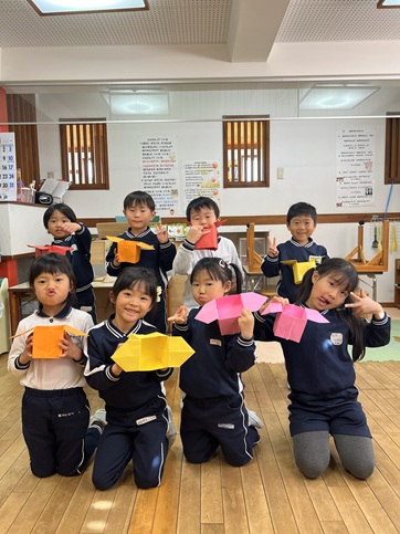 虹のクラスでもみんな「鬼こわい」と思いながら豆を入れる升やお面などを製作しています。のり付けやハサミ・色塗りや大きな色画用紙での折り紙など学年ごとに違う作品を作っています。また、すみれさんちゅうりっぷさんはみんなで豆をぶつけるために大きな段ボールで鬼の作成もしました。