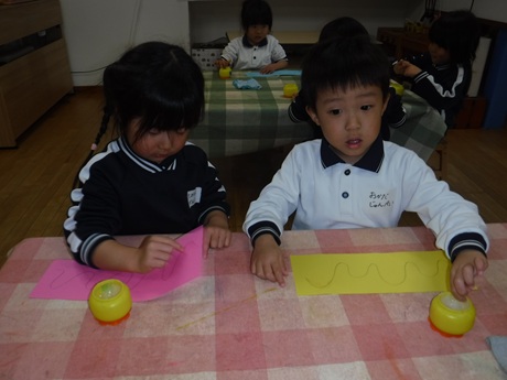 2026/01/27 節分の日が近くなってきました👹 newすみれさんは大きな色画用紙を使い升作り。大きな画用紙は折り紙とは違い固さがありましたが、しっかりと折れ目を付けてアイロンする姿が見られ、昨年作った升を思い出し、節分をイメージしながら楽しんで製作したりする姿がありました。他の学年は鬼のパンツをイメージした升で色画用紙にのりを波線に付け、黒の画用紙を貼り、破ると模様ができます。破る楽しさを感じながら、様々な模様のパンツができました。破る際、れんげさんやひまわりさんには画用紙が固く、難しそうにしていると、ちゅうりっぷさんやすみれさんが「一緒にやってあげるよ」「こうやって破るんだよ」と見本を見せてくれたりと異年齢で関わる姿が見られました。2025/12/04 劇遊びをしています!カエルに興味をもっている子どもが多いため、「10匹のかえる」の絵本をテーマに、カエルや蝶の好きな役のお面を作り、お面を付けながら歌や踊りを行う「劇遊び」を行っています!振り付けも、子ども同士で一緒に考えながら一つの踊りにしていき、ひまわりさんやれんげさんも年上の子どもの姿を見ながら、とても楽しそうに踊っている姿が見られます。ホールで劇遊びをすることもあり、帰ってくると「カエルごっこ楽しかった!」と笑顔で帰ってくる子どももいて、楽しみながら劇遊びをしています!