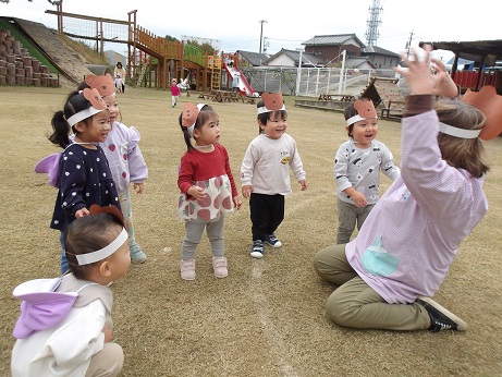 2025/12/01 11がつ☆すずらんグループ new園庭で簡単なルールのある、まてまておにごっこ『むっくりくまさん』をしました。保育者がくまのお面をかぶり、「ぐ~、ぐ~、むにゃ、むにゃ」と寝たふりをすると、それを囲んで子どもたちが集まり、「むっくりくまさん、あなのなか♪」と歌が始まります。くまに扮した保育者がいつ起きるのか、みんなで、わくわく、どきどき。「くまさん、おきて~!」の子どもたちの声で、保育者が「まて、まて~」と駆け出すと、「きゃあ~」と声を弾ませ、足取り軽く走り回っていましたよ。