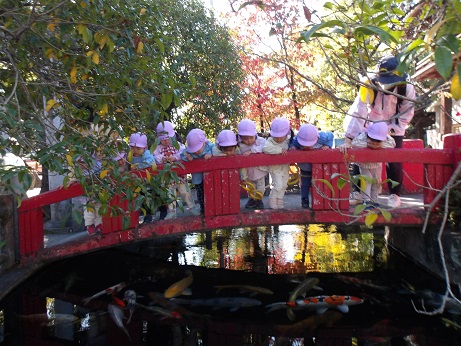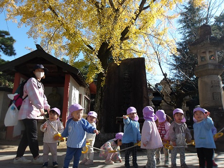 弘法さまに出かけると、きれいに色付いたイチョウの木を見上げて思わず「わぁ~」の声があがり、「きいろいね」「かわいいね」と周りに知らせる子どもたち。赤や、黄色、オレンジ色に彩られた葉っぱを拾い、互いに見せ合い楽しむ姿もありました。池の鯉に「おーい、おさかな~」「こっちおいで」「きいろのさかなが、いい!」などなど、言葉が次々に飛び出し、おしゃべりなお散歩を楽しんでいます。見たこと、感じたことを言葉にすることが楽しいようです。2025/11/28 11月☆つくしグループ new今月新しいお友だちが入所し、11人になりました。