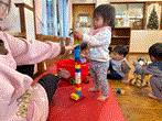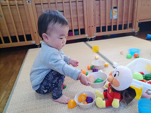 お部屋ではレゴブロックを高く積み上げたり、おままごとでは食べるまねっこをしたり、保育者や友だち、ぬいぐるみにも食べさせてあげたりする姿が見られ、ごっこ遊びを楽しんでいます。