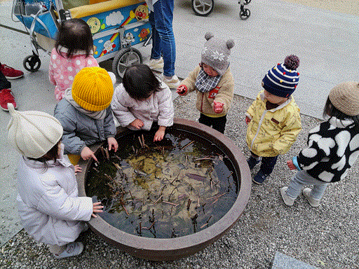また、クラス全員が歩けるようになり、保育者や友だちと手を繋いで歩くことを楽しんでいます。弘法様ではカートから降りて、先頭を歩く保育者について行きながら自由に歩いています。歩いている途中に犬に会うと「わんわん!」と呼んだり、水に氷が張っていると指先でツンツンと触り、氷の冷たさを感じる体験もできました。歩くことが楽しいつくし組のお友だち。帰りは車道を歩くのでカートに乗せるのですが、まだまだ歩きたくて泣いてしまう子もいます。