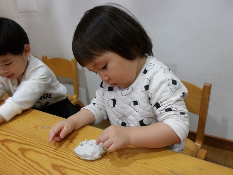 「粘土であそびましょう」と一声かけると、「やる~」「やりた~い」と椅子に座り、粘土が配られると、指先で摘んだり、丸めたり、手の平全体で潰したりと、形を変えて遊ぶことを楽しめるようになりました。中には指先を器用に使いながら粘土をねじりあげ、ソフトクリームに見立てる子もいました。イメージを働かせながら遊んでいます。