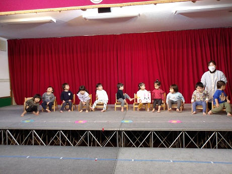 普段遊んでいることを発表会向けにアレンジして遊んでいます。順番に舞台に登場したり、お友達がお名前を発表している時は座って待つ、「今日の手遊びは何をしたい?」と保育者の問いかけに、答えたり、待ったり、自分で考えて行動したりと、簡単な決まりごとを守ることで楽しくなることを経験しています。