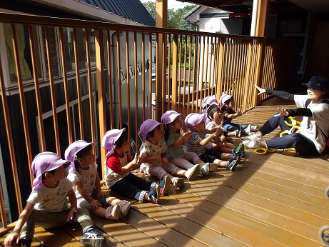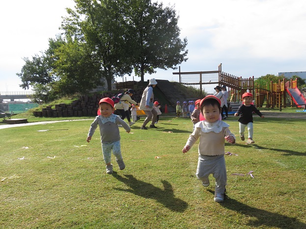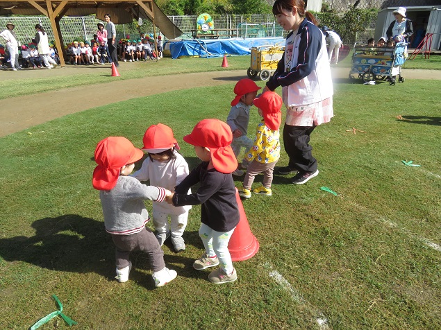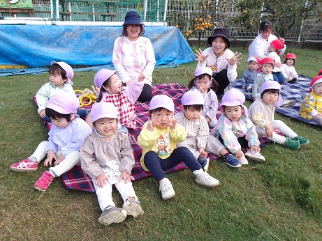 戸外に出る準備が始まると、靴を履き終えた子から座って待つことが習慣となりました。立ち上がりたくてウズウズする姿もありますが、「みんなで一緒に行きましょうね。」と繰り返し声を掛けてきたことで、その言葉が子ども達の中にしっかりと染み込んでいるようです。「おまたせ~」と言いながらやってくる友だちに、「ここ、あいてるよ~」と声をかける微笑ましい場面もありますよ。お互いの存在を意識している証拠ですね。