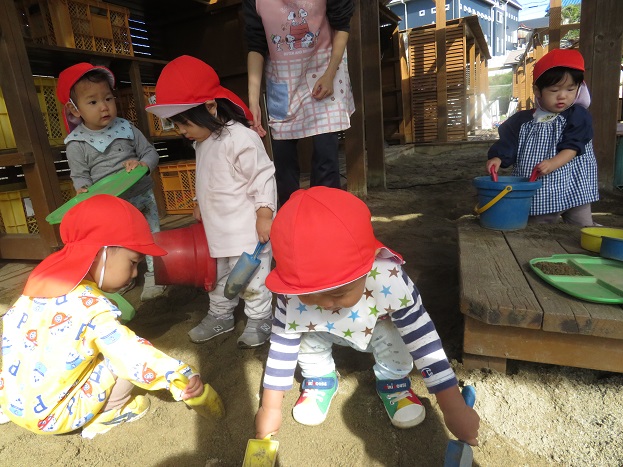 中庭や園庭など戸外で過ごしやすい気候となり、毎日楽しんでいます。砂場ではスコップを使いたくさん掘り起こしたり、ウッドマウンテンやはしご階段などの遊具に挑戦したりする子もいます。砂場の凹凸に足をとられながらも体の使い方が少しずつ上手になってきました。