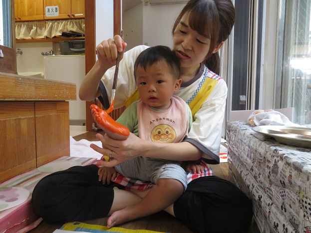 今月の製作はりんごやハロウィンのかぼちゃを作りました。自分で好きな色を選んで製作するようになってきましたよ。足型に目や口をつけ、かぼちゃにして飾ると「おばけ!」「足、ぺったん」と話していました。