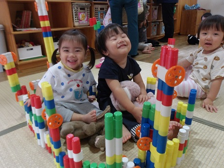 2025/10/31 10月★すずらんグループ成長すると共に、遊び方にも変化が見られるようになってきました。今までは、つなげるだけだったブロックも、それを『何か』に見立てるようになり、作ったものを子ども同士で共有することを楽しむ姿が増え、カメラを向けると笑顔で応えてくれます。