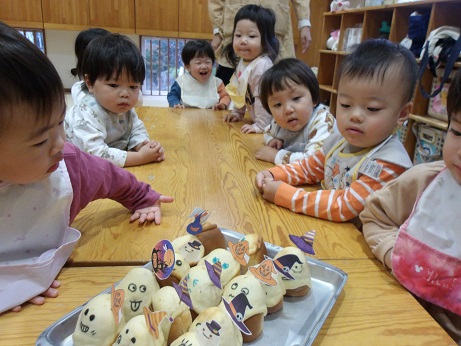運動会練習では、幼児の鼓笛演奏に心を奪われ、圧倒された表情のすずらんさんでした。大きい子への憧れも育っています。10月は調理員さんの工夫がいっぱいのハロウィンメニューがたくさんありました。透明ゼリーの中のおばけを探したり、黒猫やコウモリに型抜きされたにんじんをカレーの中に見つけたり、トレーに敷かれたランチマットにかぼちゃを見つけると、「かぼちゃ」と呟くなど、目で見ても楽しい給食に興味津々の様子でした。最終日は、おばけちゃんのパンでした♪2025/10/29 10月☆たんぽぽグループ☆新しいお友だちが1名仲間入りしました。みんなでたくさん遊びましょうね☆