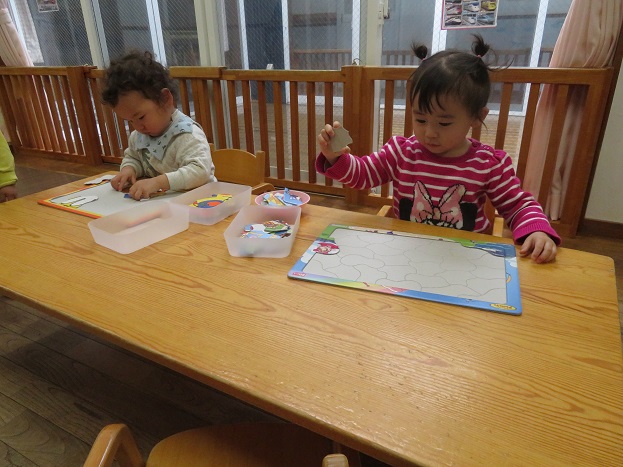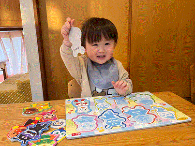 手先指先が器用になってきてできることが増え、室内ではパズルブームです。「どこだ?」と1人では難しいこともありますが、ヒントをもらいながら保育者と一緒に楽しんでいます。