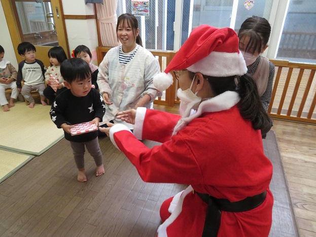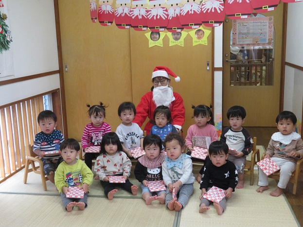 2025/12/25 12月☆たんぽぽグループ絵本の「ノンタン!サンタクロースだよ」「さんかくサンタ」、手遊びで♪キラキラメリークリスマス♪などを楽しむ中、先日たんぽぽさんのお部屋にもサンタさんが来てくれました。みんなとっても不思議そうにしていましたが、すぐそばに行って順番にプレゼントをもらうことができ、大切そうに抱えていましたよ。お部屋に掲示した写真を見て思い出し、「サンタさん来たね」と嬉しそうにお話しています。