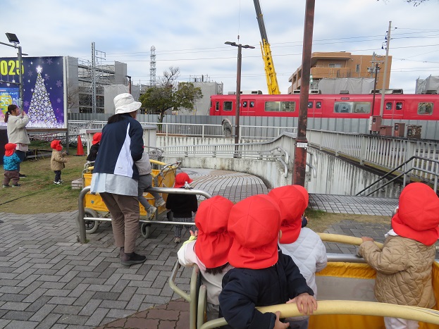 戸外では体力がついてきていろいろな遊びが楽しめるようになりました。園庭では砂場だけでなくジャングルジムやブランコ、大型遊具もしています。散歩でも長い距離歩けるようになってきて、先日は新地公園まで交代で歩き、名鉄電車やクレーン車を見てきました。乗り物好きな子が多いので近くで本物が見られて嬉しそうでした。