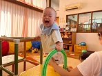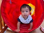 「なに何?」「何するの?」と、椅子に座り、製作の説明をする保育者を見つめ、話を聞いています。実際に目の前でやって見せると、「やりたい!」「やる!」と意欲も高まります。少しずつ先のことを見通しながら生活できるようになってきました。これもまた成長ですね。2025/08/28 8月☆つくしグループ毎日暑い日が続いていますが、室内ではジャングルジムやトンネルを出すと、何度も登ったりくぐったりして体を動かして楽しんでいます。また、おままごとではお皿やコップにごちそうを並べて食べたり飲んだりするマネをしています。ほっぺに手を当てて「おいしい」と言うことが流行っており、おままごとや給食、おやつのときも「おいしい」と言ってかわいいポーズを決めてくれています。