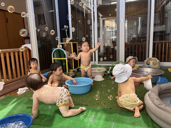 水遊びでは、プールやタライに自分から入り、水面を叩いて水しぶきを立てたり、コップを使ってジョウロに水を入れたりして楽しんでいました。また、しゃぼん玉が飛んでくると不思議そうに見つめていたり、両手を伸ばしてしゃぼん玉を触ろうとしたりする子もいました。