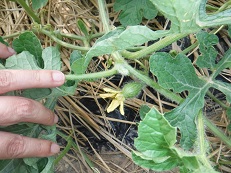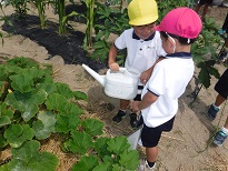 2019/07/09 夏野菜栽培子どもたちが育てている野菜を紹介します。収穫し始めたもの、調理して食べたものもありますが、まずはクイズです。この葉っぱ何の野菜かわかりますか?