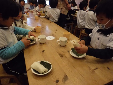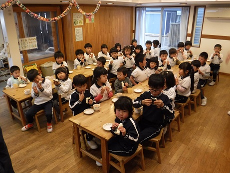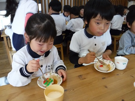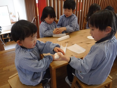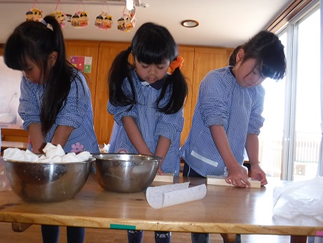 米粉に熱湯を入れ、熱々のうちに混ぜます。耳たぶくらいの柔らかさになったら、できあがり。型に色を付けた生地でを少し入れてその上に白い生地を入れ、ぎゅっと押すときれいな形に仕上がります。蒸してお醤油をつけていただきました。2019/02/05 節分クッキング1/31おやつで恵方ロールを作りました。