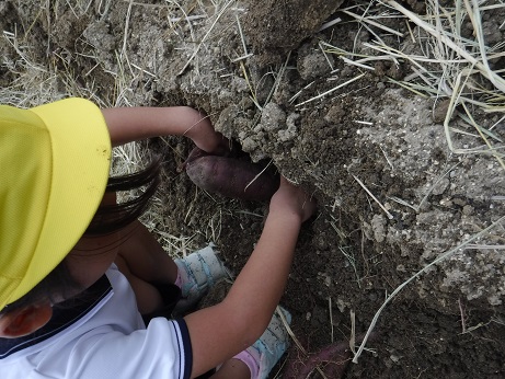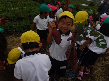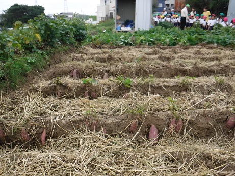 ひだを付けるのはなかなか難しですが、上手にできた子もいました。焼き立てはとってもおいしく、「まだまだ食べられる!」と箸が止まりません。食欲の秋ですね!2017/10/12 おいもほりいきいき菜園さんで芋掘りを体験させていただきました。