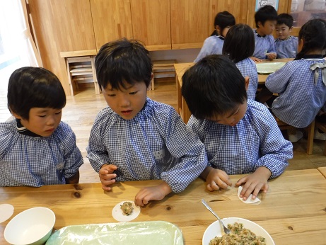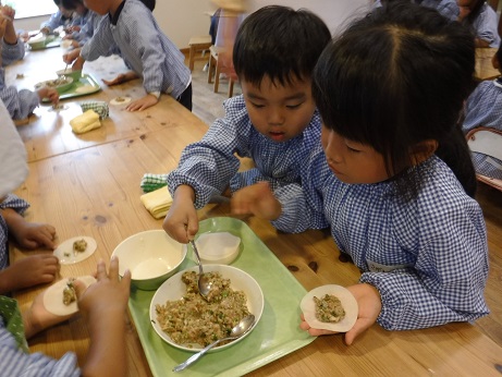 2017/11/10 ぎょうざミニクッキング餃子の皮に、調理員さんが作ってくれた種を置き、包んで、ホットプレートで焼きました。