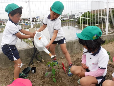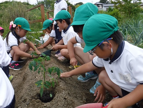 「鮮やかな色になった!」「きれ~い!」と色を確かめながらいただきました。2017/05/24 夏野菜をうえました今年はそれぞれの家で話し合いをして、どの野菜を植えるかを決めました。