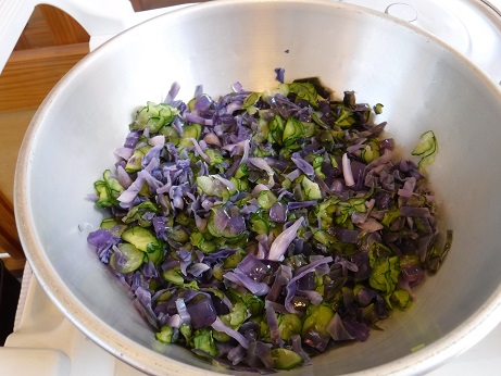 2017/06/13 あじさいサラダ紫キャベツの千切りに、寒天ゼリーときゅうりの薄切りを混ぜ、甘酢で和えると・・。