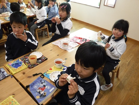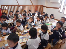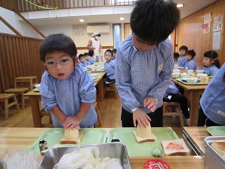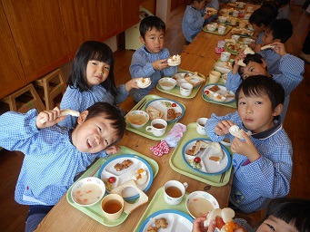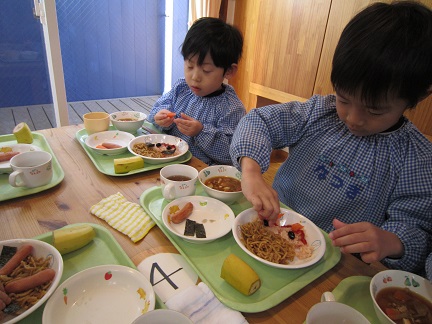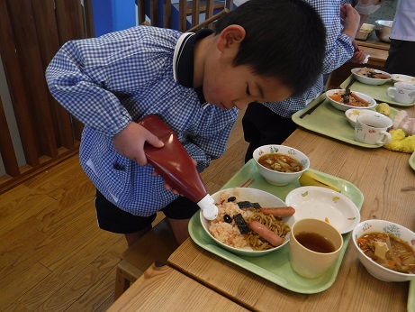 2017/02/03 赤鬼ランチ☆恵方ロール(サンドイッチ) 昨年好評だった「赤鬼ランチを今年も作りました!」全部食べたら、自分の中にいる悪い鬼を退治できる。とモリモリ食べていました。おやつは、食パンで作ったロールサンドを恵方巻きに見立て、北北西を向いて、黙って食べました。一年健康に過ごせますように!! 2016/12/22 クリスマスランチ☆パンdeリース お楽しみの給食は、パンをくりぬいて、リース型にして、飾り付けました。から揚げや、クリームシチュー大好きなものばかりで、大満足でした! ≪前のページ 次のページ≫