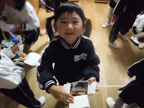 当日帰りの会でハロウィンごっこをすると「トリックオアトリート」といたずらお化けが沢山現れ、お菓子を渡し季節の行事を楽しむことが出来ました。また、お家でも感想を聞いてみてください!