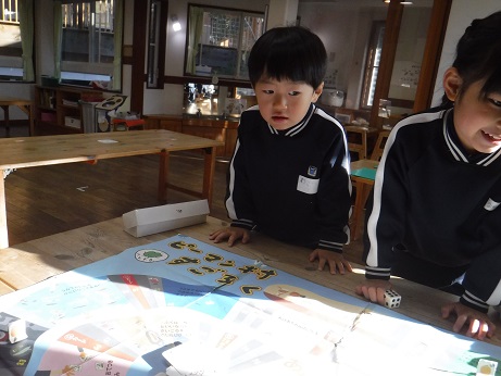 保育園では室内遊びでお正月遊びを取り入れ、コマやすごろく、福笑いと正月遊びに興味を持ち、異年齢で楽しむ姿が見られました。順番を守ったり、ルールを教えてあげたりと友だちとの関わりがより深まったように感じます!年下の子はすみれさんやちゅうりっぷさんの遊びが気になるようになり、一緒に入れてもらい遊びの幅が広がってきています!外は寒いですが、たくさん身体を動かし色々な遊びを経験していきます!