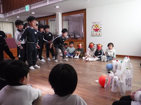 当日、ランチルームの部屋に行くと「怖い」と泣けてしまう子もいましたが、鬼がやってくると怖くてもやっつけようと豆を投げ「おにはそと、ふくはうち」と戦うことができました!最後に大きな豆で退治をすると鬼が逃げていき、表情が一気に柔らかくなり、福の神が来ることを待ち遠しくしていました。