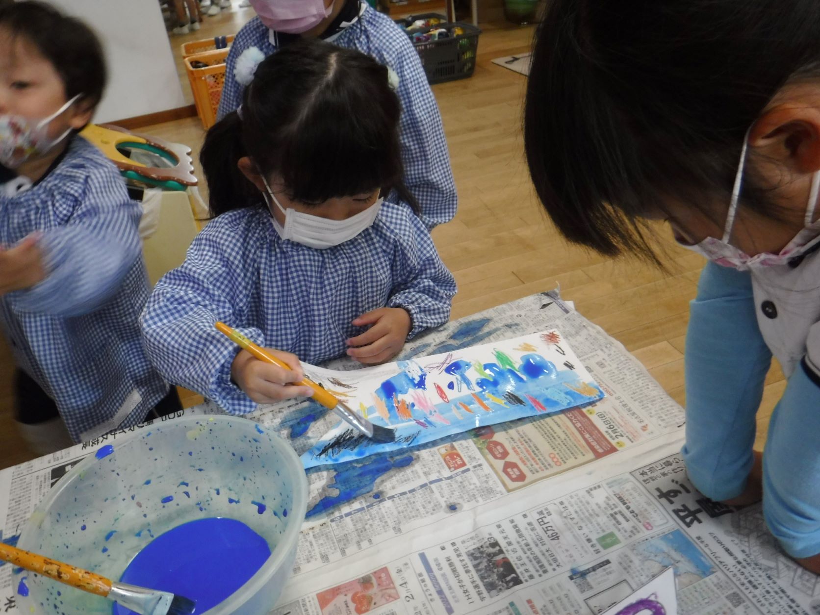 絵の具をクレヨンの模様の上に塗ると自分たちが描いた模様が浮かび上がってきてとてもきれいなこいのぼりができました!