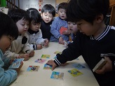 カルタでは、年上の子が読んだり取る姿を見て、年下の子も仲間に入って一緒に遊んでいます♪ひまわりさんも大好きなアンパンマンカルタで遊び、一生懸命絵札を探し、取るたびに喜んでいます♪