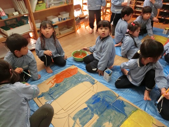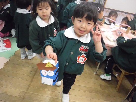 虹のクラスでもみんな「鬼こわい」と思いながら豆を入れる升やお面などを製作しています。のり付けやハサミ・色塗りや大きな色画用紙での折り紙など学年ごとに違う作品を作っています。また、すみれさんちゅうりっぷさんはみんなで豆をぶつけるために大きな段ボールで鬼の作成もしました。